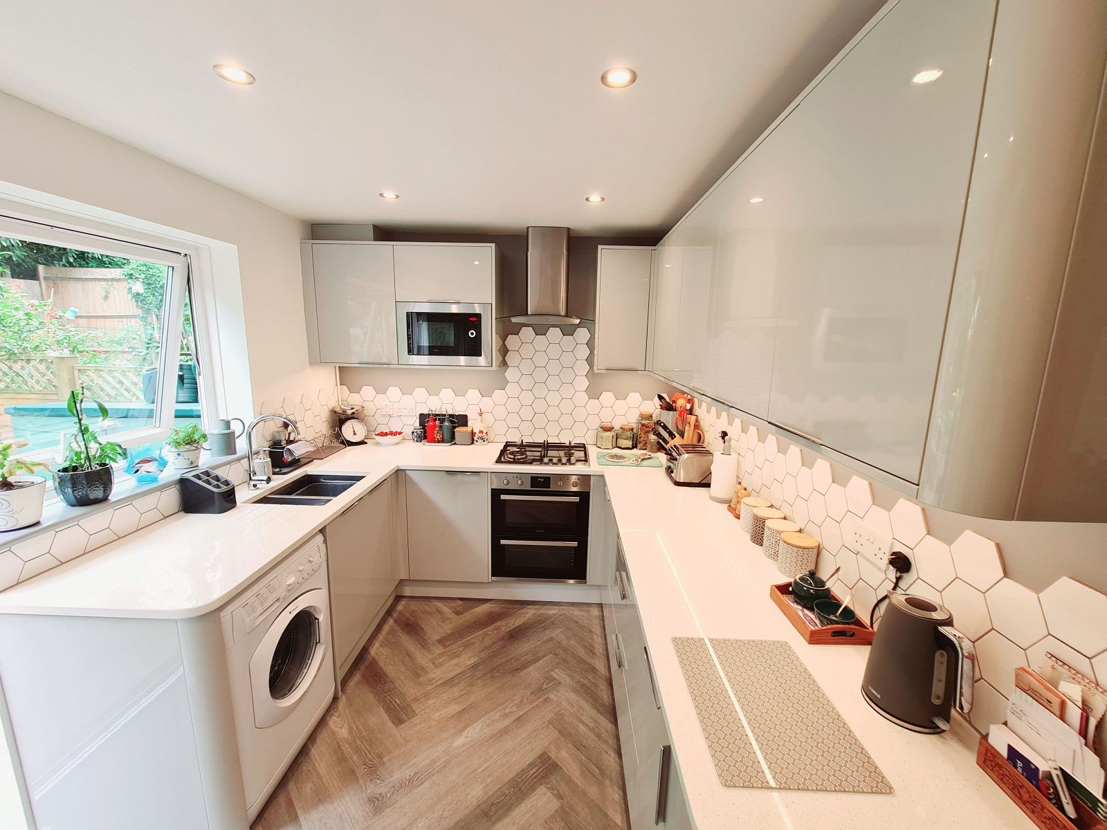 fitted with an excellent range of modern grey gloss fronted wall and floor units with contrasting quartz work surfaces, underslung one and a half bowl stainless steel sink unit with mixer tap, built in stainless steel Zanussi double oven & grill, inset Zanussi 4 ring gas hob with stainless steel chimney extractor over, eye level stainless steel microwave, plumbing and space for washing machine, appliance space, concealed LED lighting, magic pull out shelves, part tiled walls, concealed wall mounted gas fired boiler for central heating and domestic hot water, radiator, light grey floor, further matching tall units incorporating larder unit, sealed unit double glazed window and double glazed door opening into the rear garden.