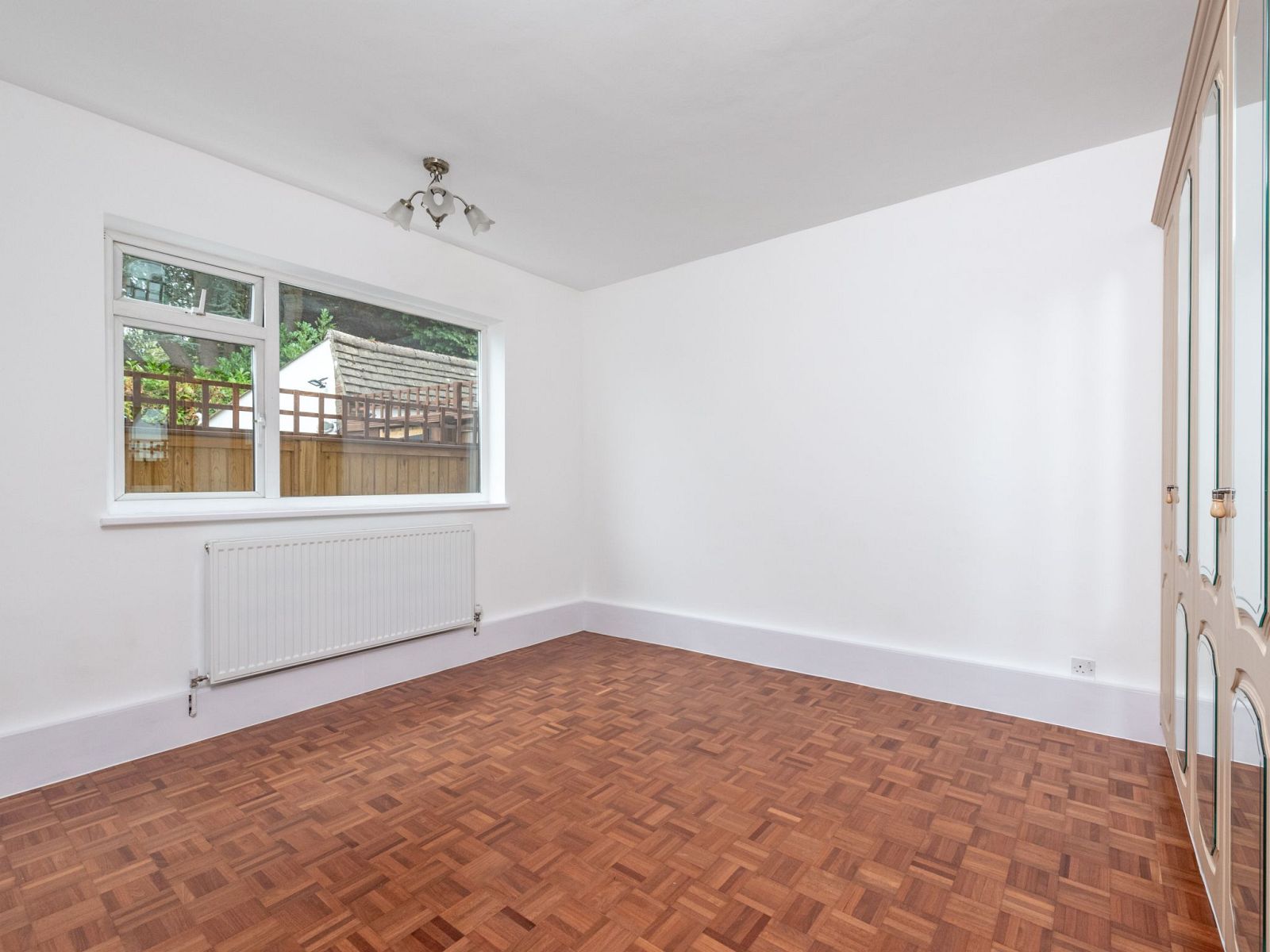 A welcoming hallway opens to a superb sitting/dining room measuring 19' x 17'. Full-width sliding doors frame the outlook to the garden and draw in the light, while the original parquet flooring adds warmth and character. The separate kitchen is well arranged with good worktop space and a door straight out to the garden - ideal for everyday convenience. There are two comfortable double bedrooms and a contemporary wet-room style shower room, complemented by a separate WC.
