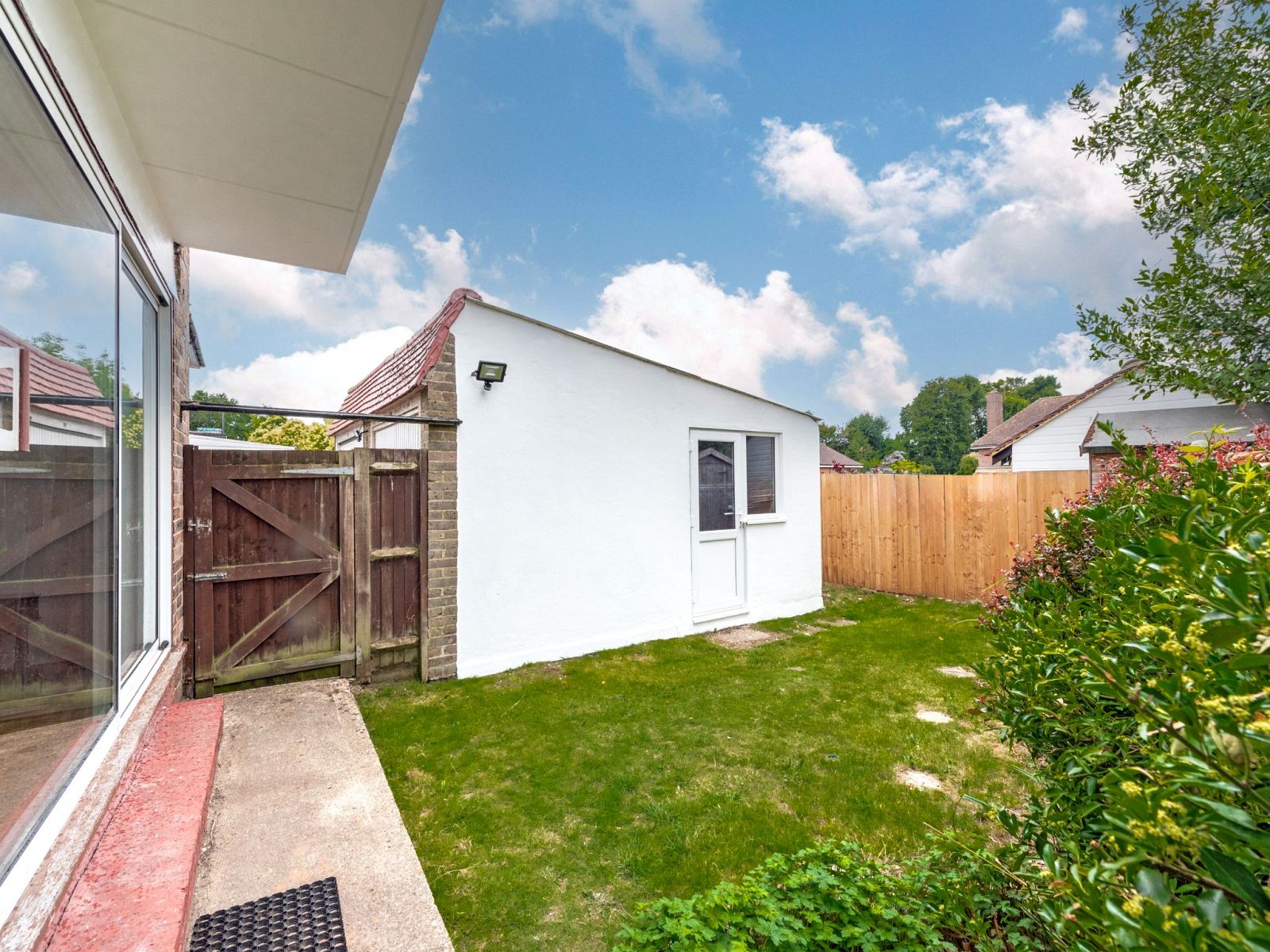 Outside, the private rear garden offers a level lawn with mature borders. A linked detached garage sits to the side, accessed via a shared driveway, providing secure storage or parking.