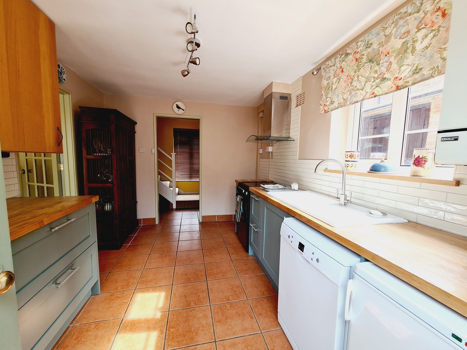 Fitted with a range of wooden fronted and shaker style wall and floor units complimented with timber work surfaces, inset single drainer single bowl sink unit, mixer tap, freestanding Bosch dishwasher and Zanussi freezer, freestanding Hotpoint oven, stainless steel & glass extractor hood, tall appliance space, part tiled walls, double aspect, sealed unit double glazed window, ideal wall mounted gas fire boiler for central heating and domestic hot water, tiled floor, part glazed door to: