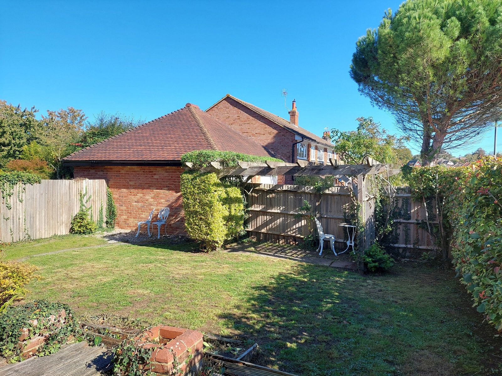 The garden is laid to lawn with timber deck and is partly enclosed by 1.8m high panel fencing, at the end of the garden is a paved patio and timber pergola.
