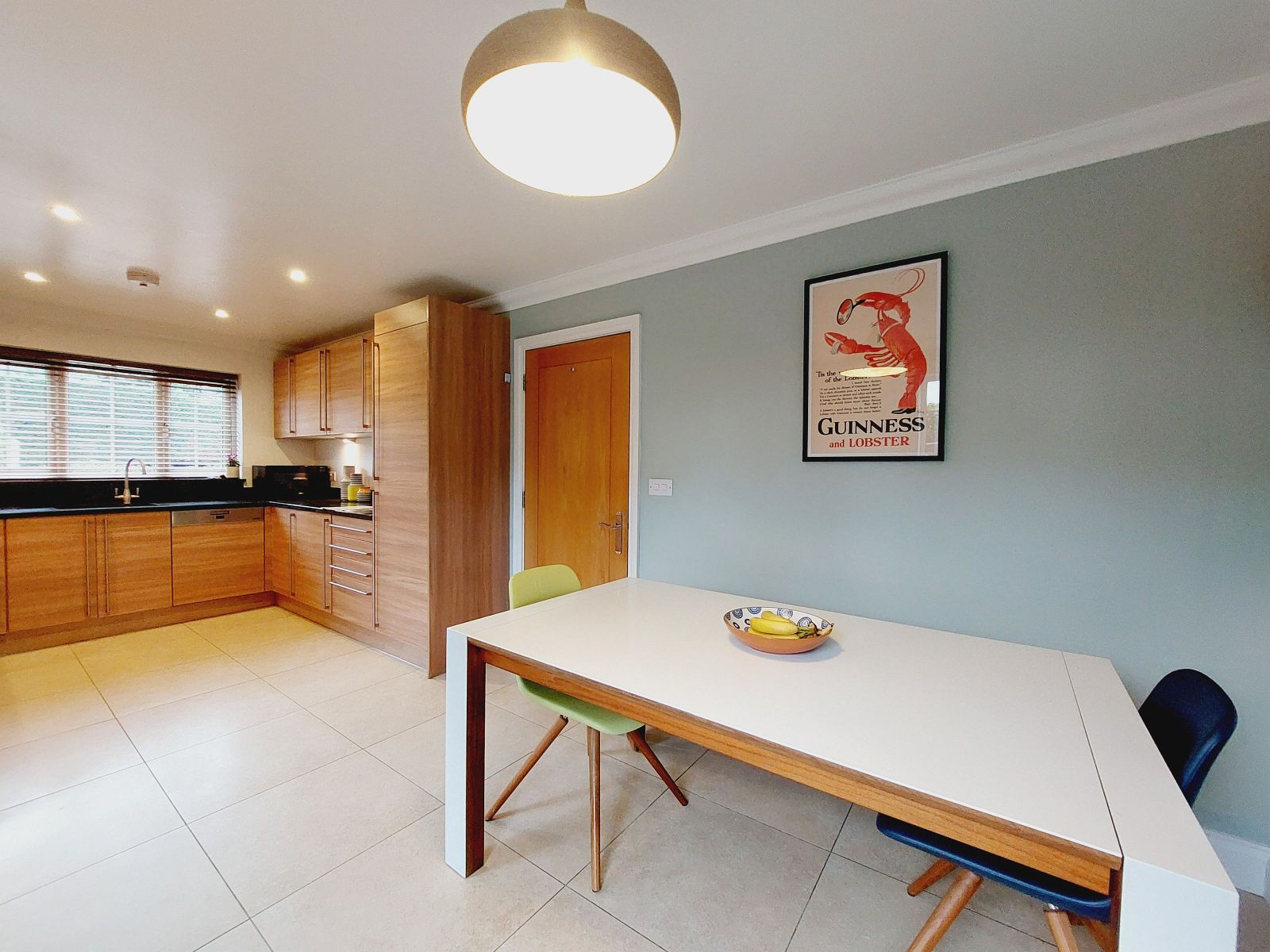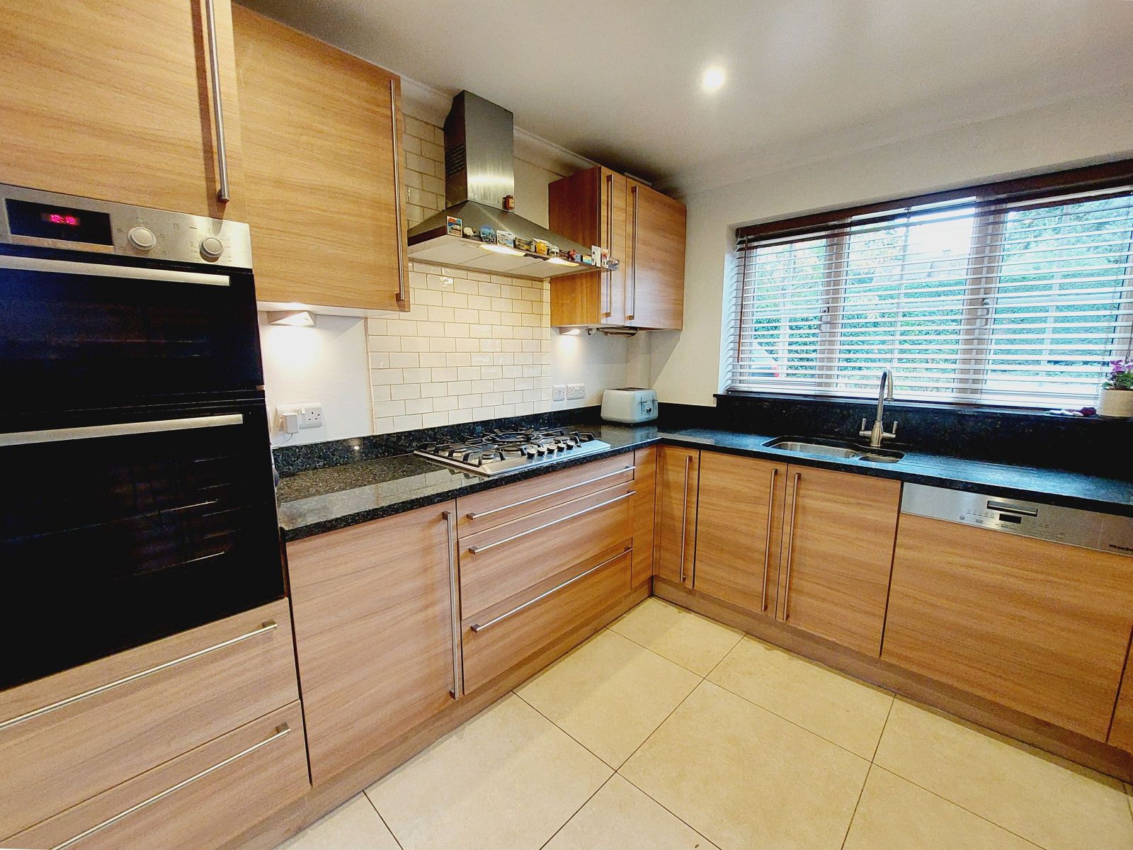 Fitted with an excellent & comprehensive range of modern wooden fronted wall and floor units with stainless steel bar handles and complimented by contrasting granite work surfaces, underslung one and half bowl stainless steel sink unit, mixer tap, built in eye level Bosch double oven/grill, inset 5 ring gas hob, stainless steel extractor fan/hood above, under counter lights, deep pan drawers, integrated fridge/freezer, integrated dishwasher & washing machine, granite upstand & window cill, recessed ceiling lights, sealed unit double glazed window, ceramic tiled floor, under flooring heating, dining area with part double glazed door to outside, ceramic tiled floor, sealed unit double glazed window, double doors opening up to: