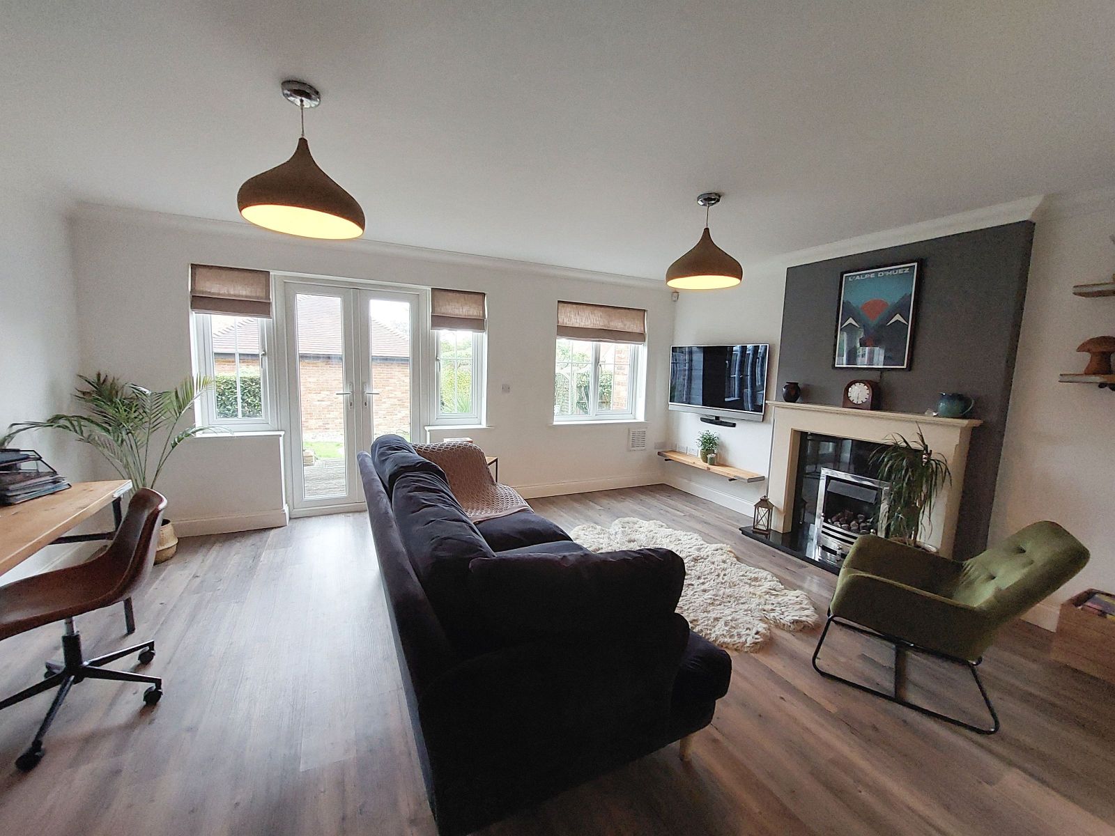 max, attractive central stone fireplace with gas coal effect fire, recessed ceiling lights, under floor heating, light grey timber effect flooring, built in storage cupboard, sealed unit double glazed window & double doors opening to garden.