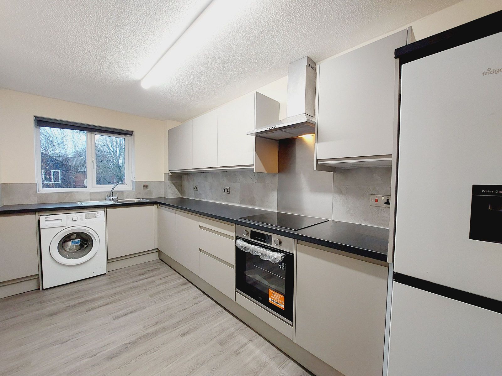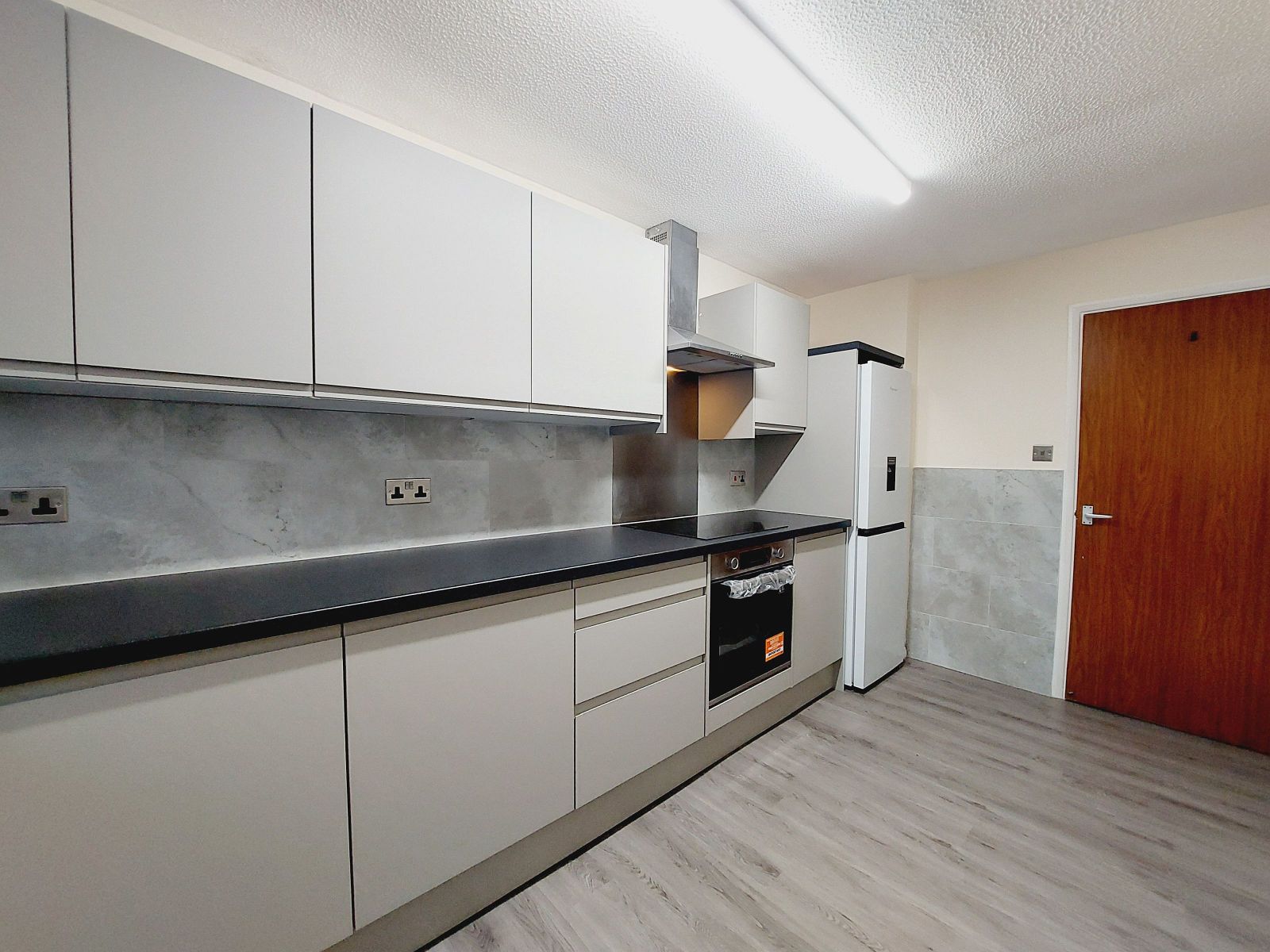 Very spacious and newly fitted with an excellent range of grey fronted handleless wall & floor units with contrasting worksurfaces, inset single drainer stainless steel sink unit with mixer tap, built in stainless steel electric oven & grill, inset 4 ring ceramic hob, stainless steel splashback & extractor/chimney hood above, freestanding fridge/freezer, washing machine, part tiled walls, grey wood effect floor, sealed unit double glazed window.