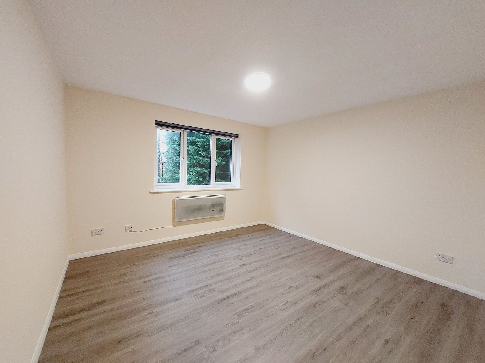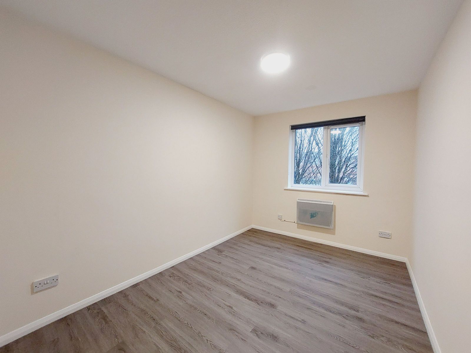 wall mounted electric heater, grey wood effect floor, sealed unit double glazed window, rear aspect.